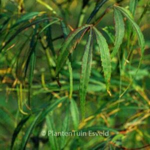 Lineate green foliage and yellow autumn colour. This plant grows to about 300 cm. The leaf colour is green. This plant is hardy. Recommended quantity per square meter : 1. Common name : Smooth japanese maple Possible alternatives : Acer palmatum ‘Ao-shime’. Main difference: Acer palmatum ‘Kinshi’ somewhat coarser or leaves. Acer palmatum ‘Koto-no-ito’. Main difference: Acer palmatum ‘Koto-no-ito’ more slender leaves. Acer palmatum ‘Linearilobum’. Main difference: Acer palmatum ‘Linearilobum’ more slender leaves. This plant has received the following award: AGM, Award of Garden Merit, 2012. . Is present in the nursery, but must be ordered in advance.