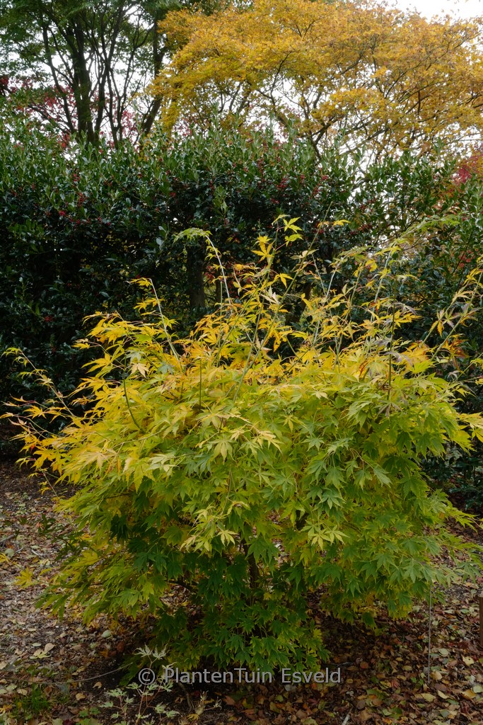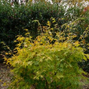 Greenish yellow leaves wit radiating orange-red autumn colour. The size after 10 years is 2,5 m. The flowering period is May. This plant is completely hardy. Recommended quantity per square meter : 1. Common name : Smooth japanese maple . . Is present in the plant shop. Please check actual availability in the current stocklist.