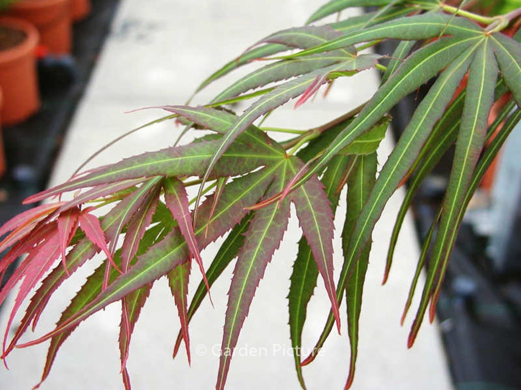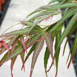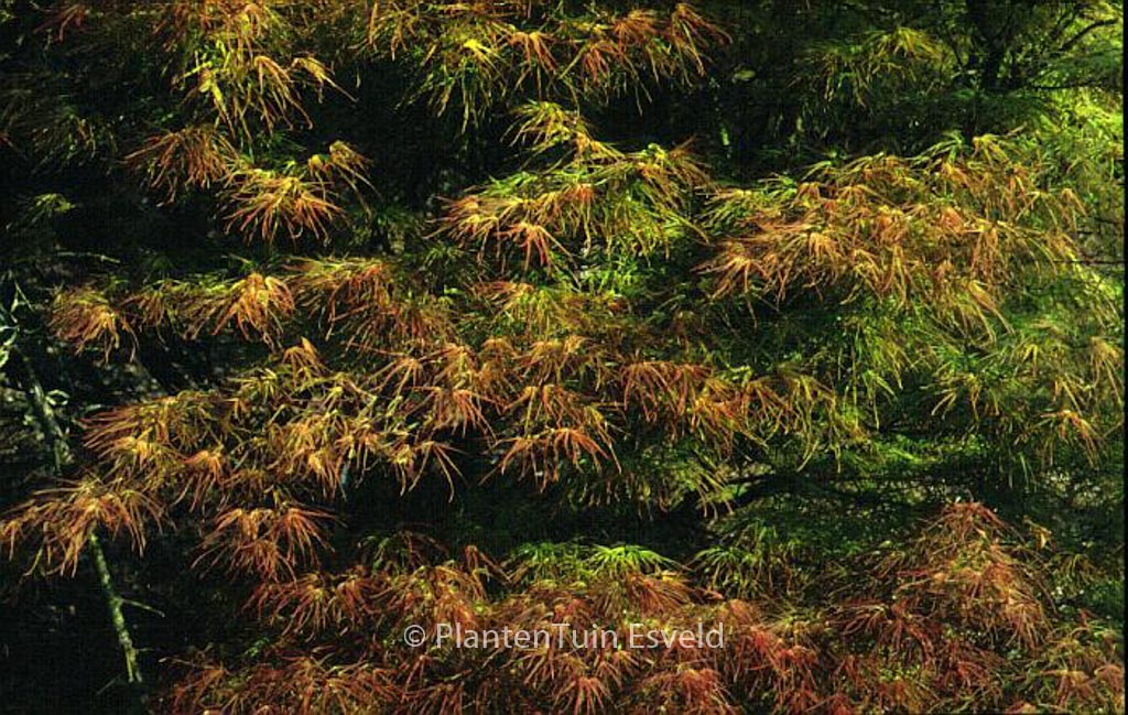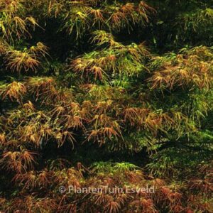 Semi-dwarf with linear lobes, orange autumn colour. This plant grows to about 250 cm. The leaf colour is bronze-green. This plant is hardy. Recommended quantity per square meter : 1. Common name : Smooth japanese maple Possible alternatives : Acer palmatum ‘Atrolineare’. Main difference: Acer palmatum ‘Atrolineare’ somewhat redder leaves. Acer palmatum ‘Enkan’. Main difference: Acer palmatum ‘Enkan’ many redder leaves. Acer palmatum ‘Red Pygmy’. Main difference: Acer palmatum ‘Red Pygmy’ has redder leaves. This plant has received the following award: AGM, Award of Garden Merit, 2012. This plant was introduced by us in 1967. . Only available when ordered in advance.