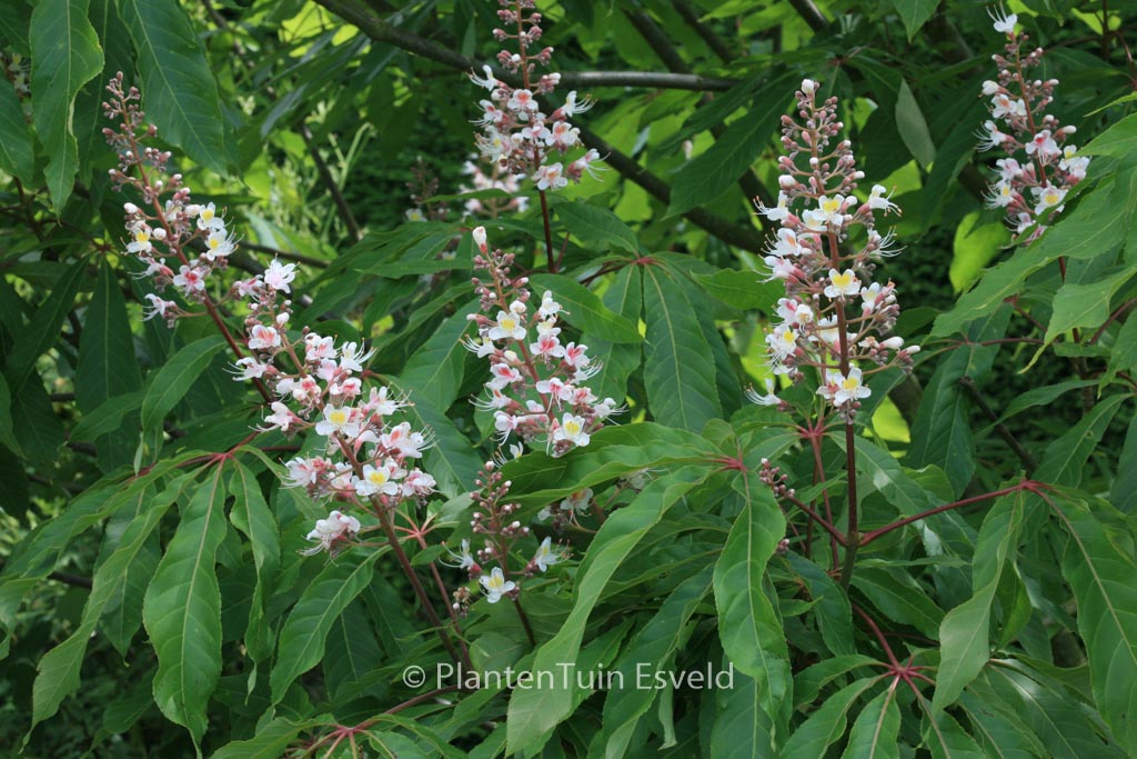 Indian chestnut with remarkable flower colour. The size after 10 years is 6 meter. The flower colour is pink. The flowering period is May. This plant is hardy. Recommended quantity per square meter : 1. Common name : Indian horse chestnus . . Is present in the plant shop. Please check actual availability in the current stocklist. .