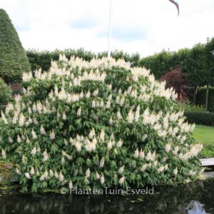 summer flowering chestnut wide growing shrub. The size after 10 years is 300 cm. The flower colour is white. The flowering period is June – August. This plant is completely hardy. Recommended quantity per square meter : 1. Common name : Bottle-brush buckeye . This plant has received the following award: AGM, Award of Garden Merit, 1993. . Only available when ordered in advance.