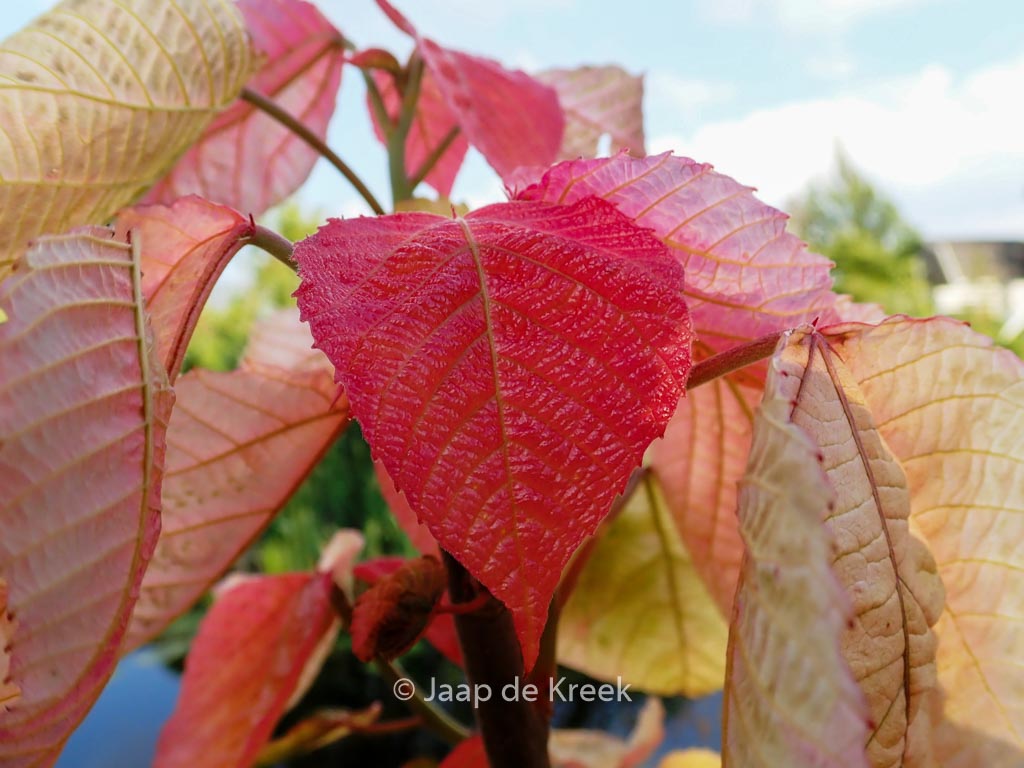 Deciduous shrub from China with pink spring leaves. The size after 10 years is 200 cm. The leaf colour is pink new growth, later green. The flowering period is May – June. This plant is mostly hardy. . . Is present in the plant shop. Please check actual availability in the current stocklist. . . .