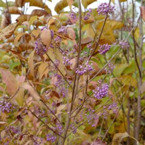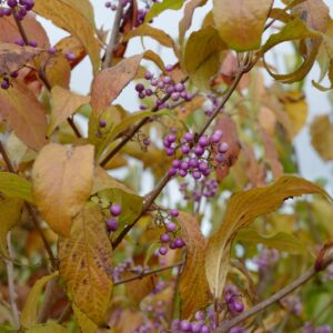 Selection with coppery-red autumn-colour; violet berries. This plant grows to about 2,5 m. The flower colour is inconspicuous soft-pink. The flowering period is July. This plant is hardy. Recommended quantity per square meter : 1. Common name : Beauty berry . . Is present in the plant shop. Please check actual availability in the current stocklist.