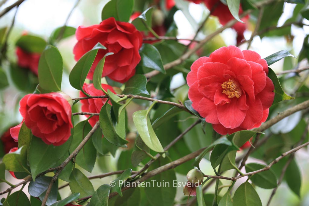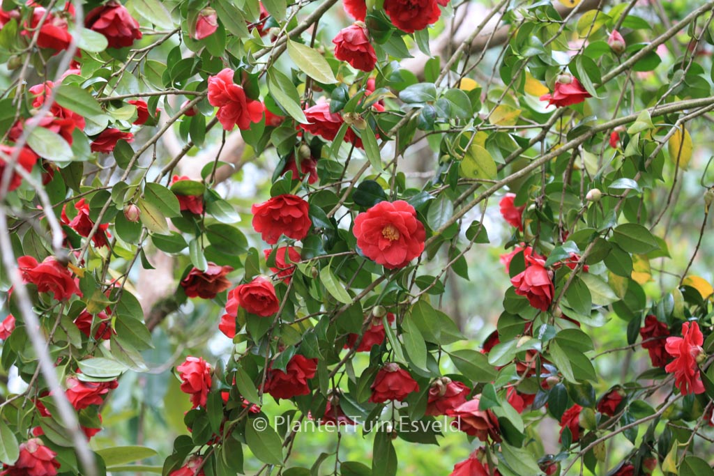 semi-double flowers sheltered place. The size after 10 years is 200 cm. The flower colour is dark red. The flowering period is February – April. This plant is mostly hardy. Common name : Common camellia . This plant has received the following award: AGM, Award of Garden Merit, 1993. . Is present in the plant shop. Please check actual availability in the current stocklist.