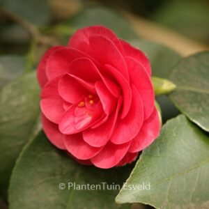 evergreen shrub vigorous wide upright growing growt. The size after 10 years is 200 cm. The flower colour is bright red. The flowering period is March – April. This plant is hardy. Recommended quantity per square meter : 1. Common name : Common camellia . . Only available when ordered in advance.