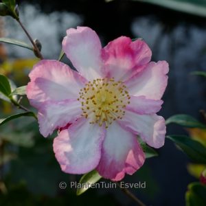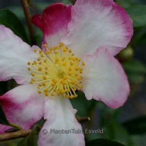 Large, single, white flowers with shades of pink. This plant grows to about 2 m. The flower colour is white with (soft-) pink. The flowering period is November – December. This plant is hardy. Recommended quantity per square meter : 1. Common name : Camellia . . Is present in the plant shop. Please check actual availability in the current stocklist.