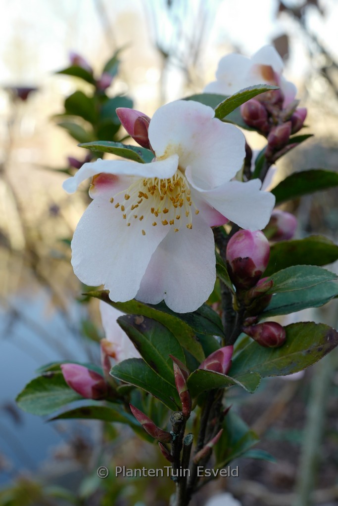 Very fragrant; tolerates pruning, thus suited for hedges. This plant grows to about 2 m. The flower colour is white with very light pink. The flowering period is December – January. This plant is hardy. Recommended quantity per square meter : 1. Common name : Camellia . . Is present in the plant shop. Please check actual availability in the current stocklist.