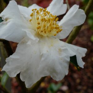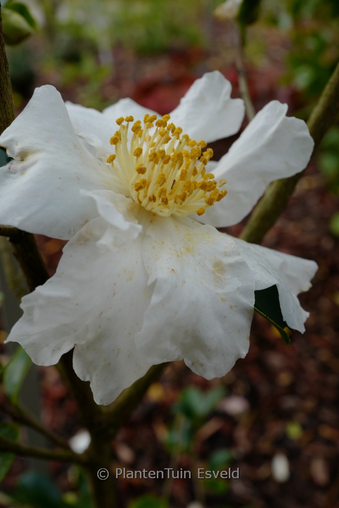 Large, semi-double flowers with wavy edges. This plant grows to about 2 m. The flower colour is white with yellow antlers. The flowering period is November – January. This plant is hardy. Recommended quantity per square meter : 1. Common name : Camellia . . Is present in the plant shop. Please check actual availability in the current stocklist.