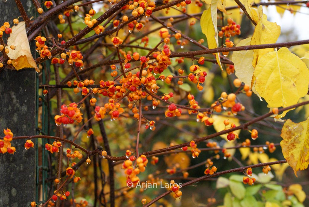 Actinidia, female. form needs a man. The size after 10 years is 5 m. The berry colour is orange. The flowering period is October. This plant is completely hardy. Beginning in 2027 the planting of Celastrus orbiculatus will be forbidden. . . Only available when ordered in advance.