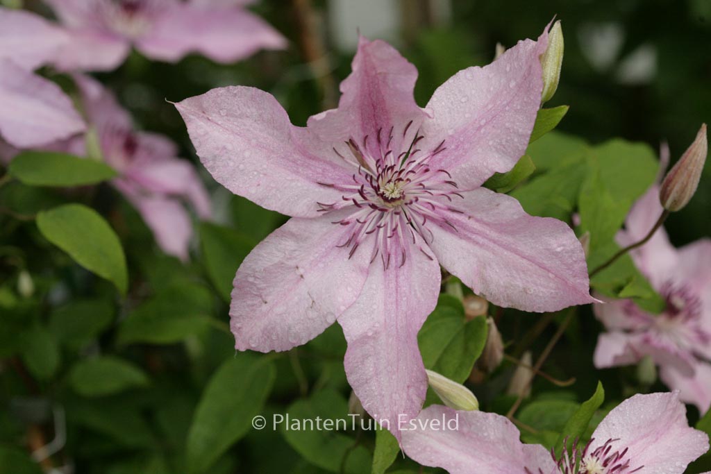 Jackmanii-group, slow prune. The size after 10 years is 3 m. The flower colour is light pink. The flowering period is June – August. This plant is completely hardy. Recommended quantity per square meter : 1. Possible alternative : Clematis ‘Pink Fantasy’. Main difference: Clematis ‘Hagley Hybrid’ more slender flower, grows harder. . Only available when ordered in advance.