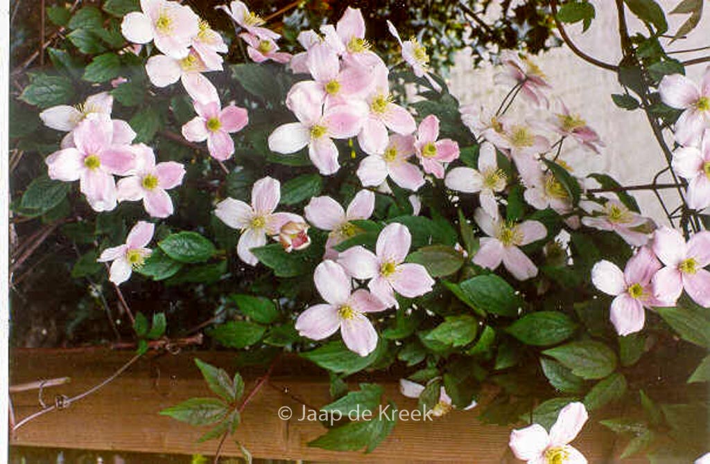 very strong growing climber, prune after the flowering. The size after 10 years is 5 m. The flower colour is light pink. The flowering period is May – June. This plant is completely hardy. Recommended quantity per square meter : 1. Possible alternative : Clematis montana. Main difference: Clematis montana ‘Rubens’ somewhat darker pink flowers. . Is present in the plant shop. Please check actual availability in the current stocklist. .