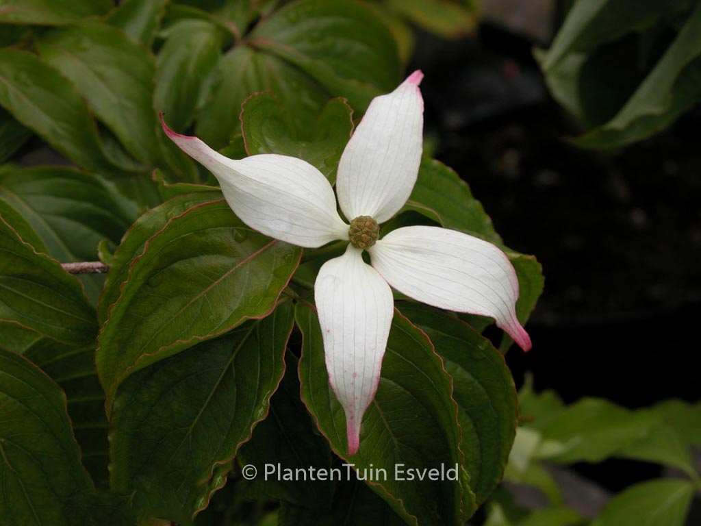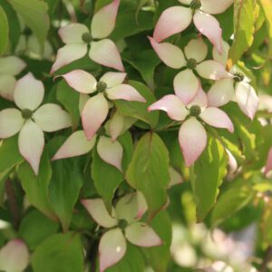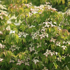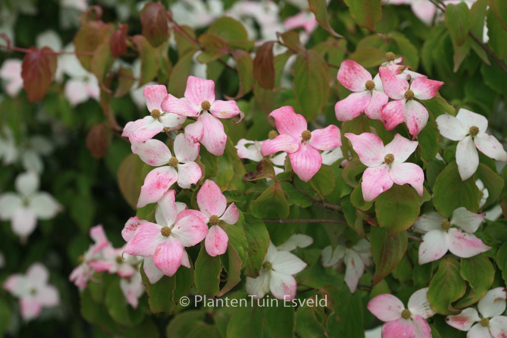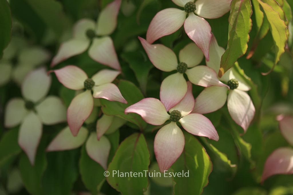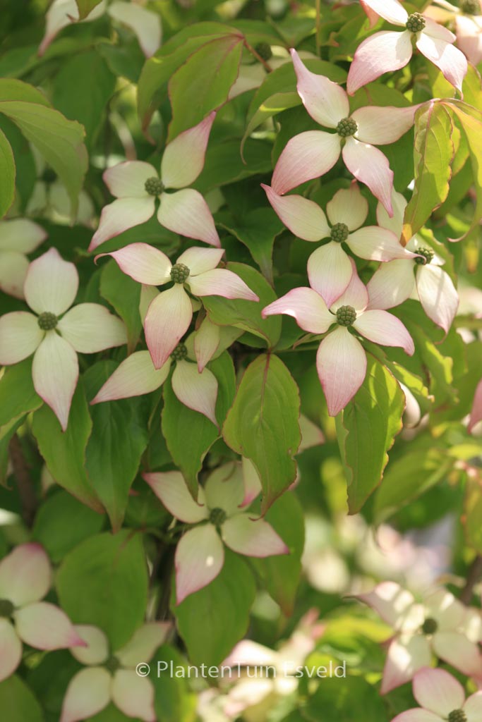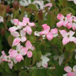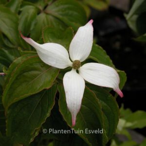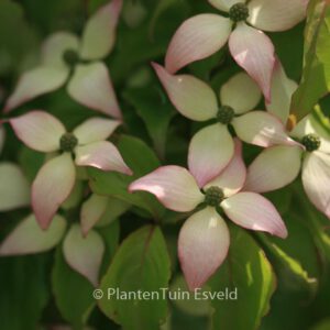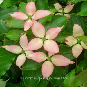 low and spreading growth. The size after 10 years is 125 cm. The flower colour is light pink. The flowering period is May – June. This plant is hardy. Recommended quantity per square meter : 1. Common name : Kousa dogwood . . Only available when ordered in advance.
