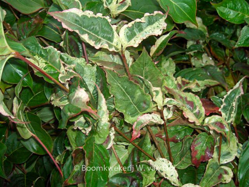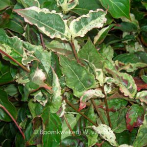 beautiful variegated soort cream-white and pink stripes. The size after 10 years is 100 cm. The flower colour is white. The flowering period is May – June. This plant is hardy. Recommended quantity per square meter : 1. Common name : Kousa dogwood . . Only available when ordered in advance.