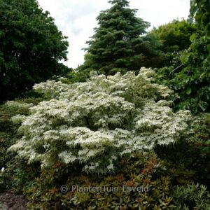 a of the best variegated leaved! greygreen with white edge. The size after 10 years is 2 meter. The flower colour is white. The flowering period is May – June. This plant is hardy. Recommended quantity per square meter : 1. Common name : Kousa dogwood . This plant has received the following award: AGM, Award of Garden Merit, 2012. . Only available when ordered in advance.