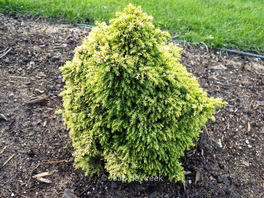 Upright, conical dwarf with yellow, young needles. This plant grows to about 30 cm. This plant is completely hardy. Recommended quantity per square meter : 7. . . Only available when ordered in advance.