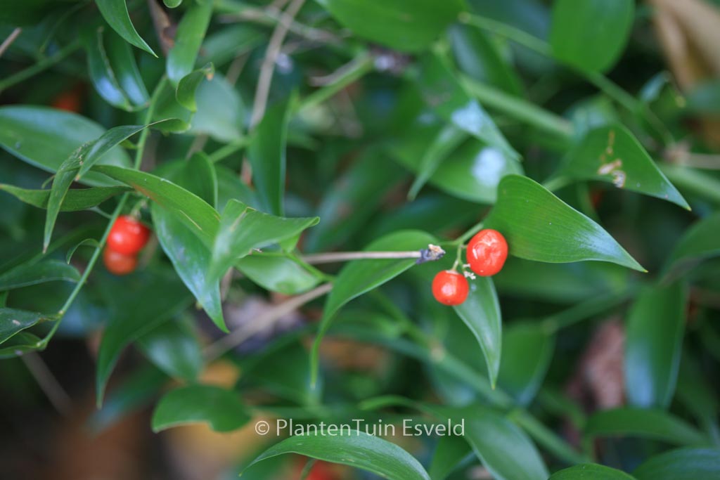 evergreen shrublet with inconspicous flowers. The size after 10 years is 100 cm. The flower colour is white, berries orangered. The flowering period is May. This plant is mostly hardy. Recommended quantity per square meter : 1. . This plant has received the following award: AGM, Award of Garden Merit, 2012. . Only available when ordered in advance.
