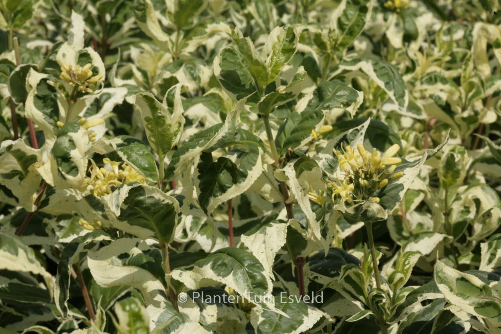variegated summer floweing shrub. The size after 10 years is 100 cm. The flower colour is yellow. The flowering period is July. This plant is completely hardy. Common name : Bush honey-suckle . . Is present in the plant shop. Please check actual availability in the current stocklist.
