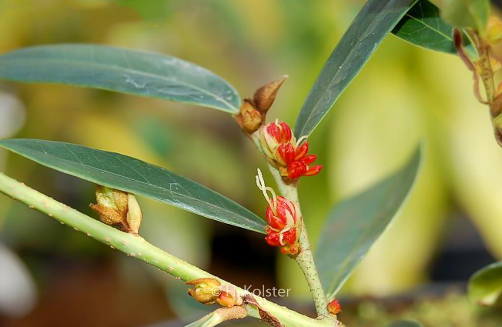 evergreen shrub very special spring flowers. The size after 10 years is 200 cm. The flower colour is brownish white. The flowering period is March – April. This plant is hardy. Possible alternative : . Distylium racemosum. Main difference: probably identical. . Only available when ordered in advance. .