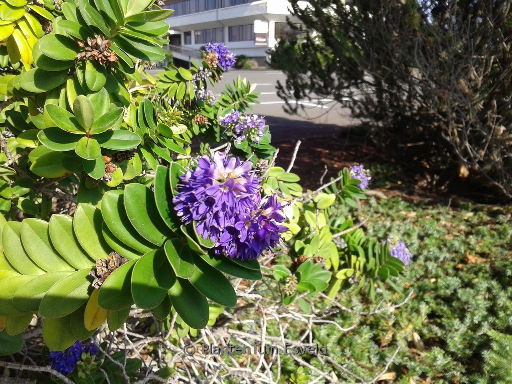 evergreen shrub. The size after 10 years is 80 cm. The flower colour is blue. The flowering period is August – September. This plant is not hardy. Common name : Hebe . . Only available when ordered in advance. .