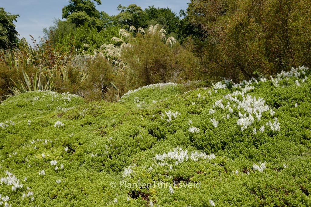 dwarf. The size after 10 years is 30 cm. The flower colour is white. The flowering period is June – August. This plant is mostly hardy. Recommended quantity per square meter : 5. Common name : Hebe . This plant has received the following award: AGM, Award of Garden Merit, 1993. . Only available when ordered in advance.