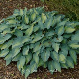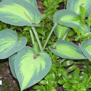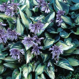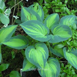 Yellow centre and a bluish green edge, one of the best. This plant grows to about 40 cm. The flower colour is lilac. The flowering period is June – July. This plant is hardy. Recommended quantity per square meter : 5. . This plant has received the following award: AGM, Award of Garden Merit, 2004, also Gold Medal Trade Show Plantarium 1992. . Only available when ordered in advance.
