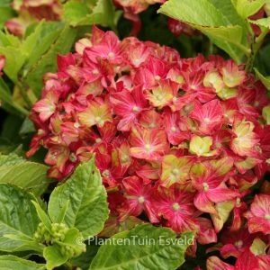 multicoloured mophead pink with blue heart, green tips. This plant grows to about 125 cm. The flower colour is pink/green. The flowering period is July – September. This plant is hardy. Recommended quantity per square meter : 3. Common name : Hydrangea . . Is present in the plant shop. Please check actual availability in the current stocklist. .