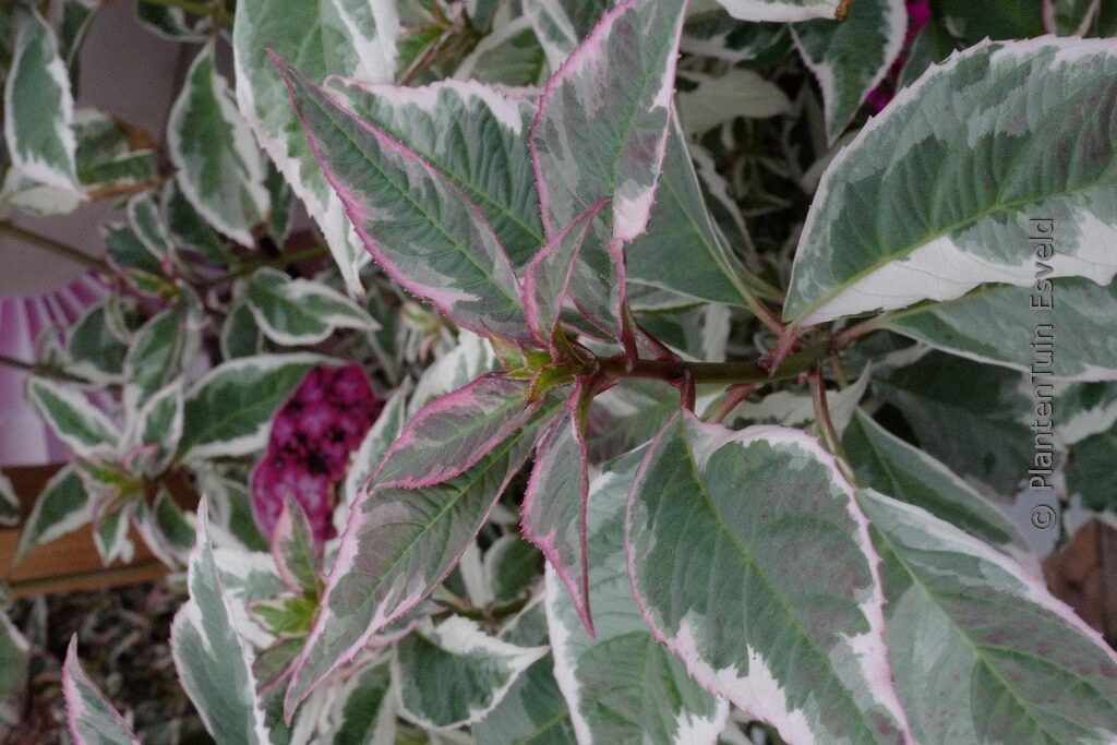 Lace-cap with heavily white variegated foliage. This plant grows to about 100 cm. The flower colour is pink. The flowering period is June – July. This plant is hardy. Recommended quantity per square meter : 3. Common name : Hydrangea . . Is present in the plant shop. Please check actual availability in the current stocklist.