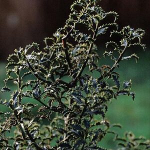 bizarre growing holly with narrow soft thorned leaves. The size after 10 years is 150 cm. The leaf colour is dark green. This plant is completely hardy. Common name : Holly tree . . Only available when ordered in advance.
