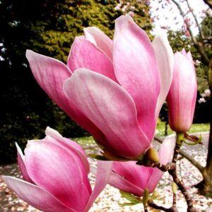 shrubby large flowered e Magnolia relative long flowering. The size after 10 years is 5 m. The flower colour is light pink. The flowering period is April. This plant is completely hardy. Common name : Sauces magnolia . . Only available when ordered in advance.