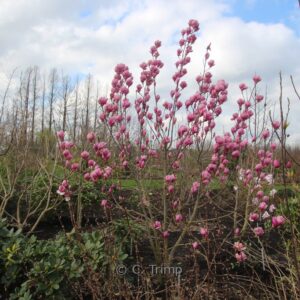 Cross M ‘Dark Shadow’ x M. camp. mollicomata by M. Foster. This plant grows to about 4 meter. The flower colour is pink. The flowering period is May. This plant is hardy. Recommended quantity per square meter : 1. Common name : Magnolia . . Only available when ordered in advance.