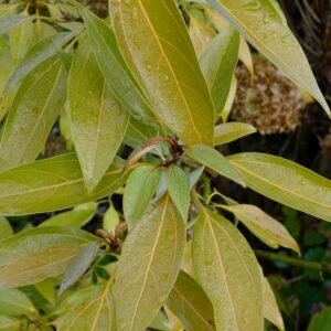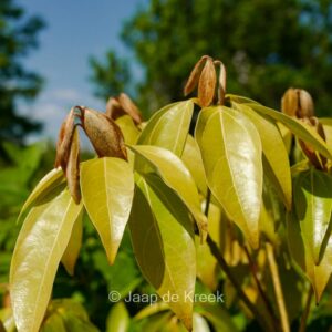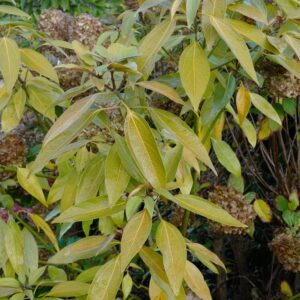 large shrub with greygreen leaves. The size after 10 years is 4 m. The flower colour is pale yellow. The flowering period is September – October. This plant is not hardy. . . Only available when ordered in advance.