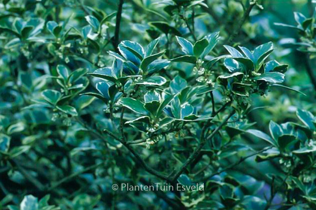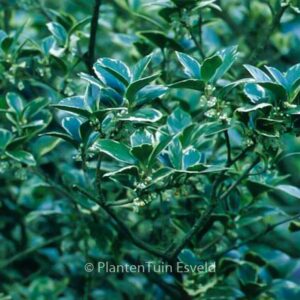 variegated false holly with fragrant flowers in autumn. The size after 10 years is 150 cm. The flower colour is white. The flowering period is September. This plant is hardy. Recommended quantity per square meter : 3. Common name : Osmanthus . . Is present in the plant shop. Please check actual availability in the current stocklist.