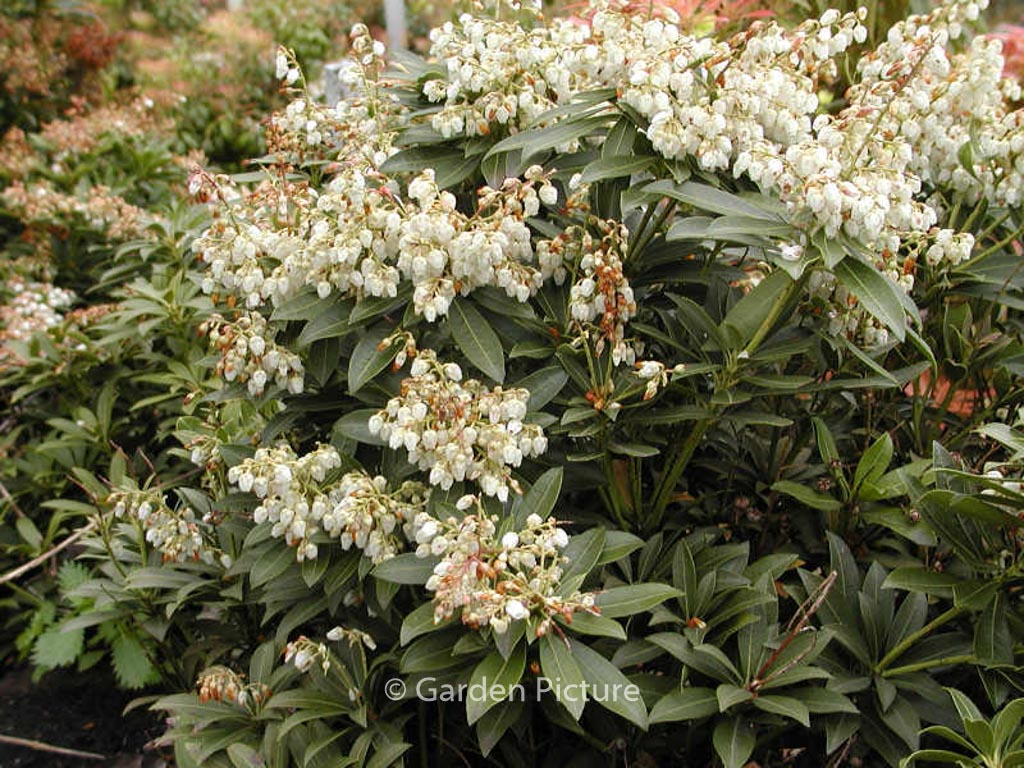 dwarf shrub, acid soil ! medium shade/sun. The size after 10 years is 100 cm. The flower colour is white. The flowering period is April. This plant is completely hardy. Common name : Pieris Possible alternative : Pieris japonica ‘Prelude’. Main difference: Pieris japonica ‘Prelude’ flower truss more pendulous. This plant has received the following award: Award of Merit by the Royal Society for Boskoop Cultures 1983, also 3 stars (excellent) field judging by the Royal Society for Boskoop Cultures 1997. . Is present in the plant shop. Please check actual availability in the current stocklist.