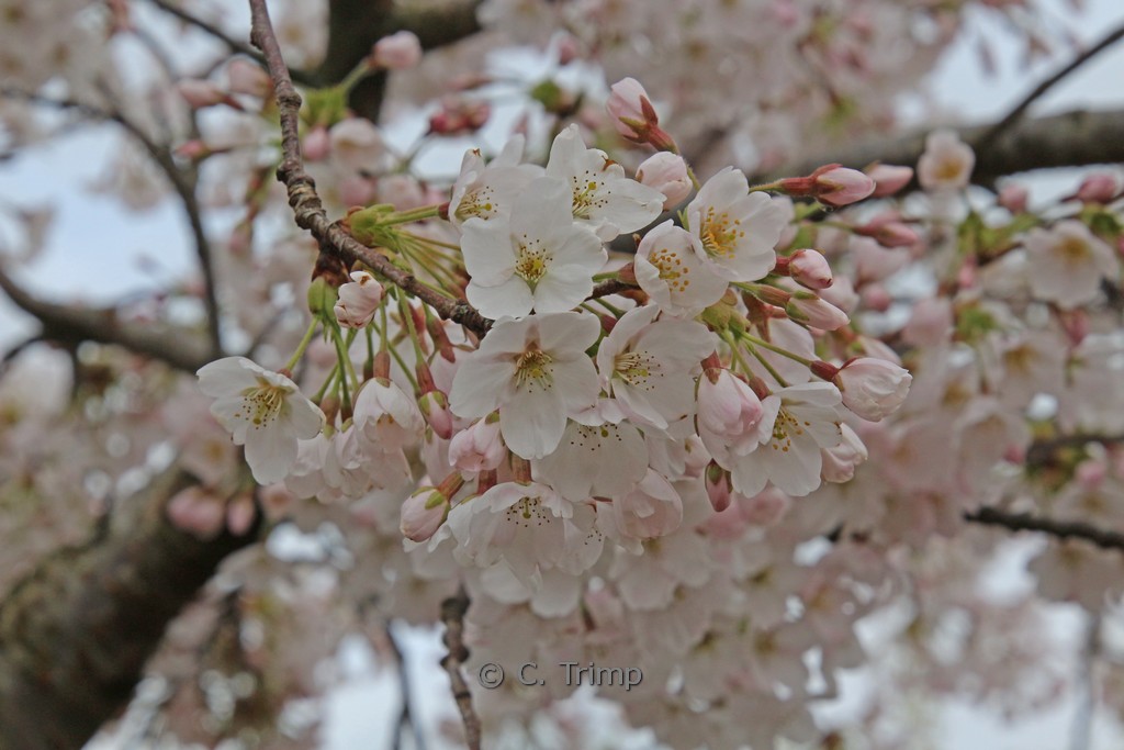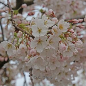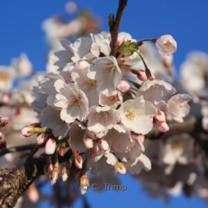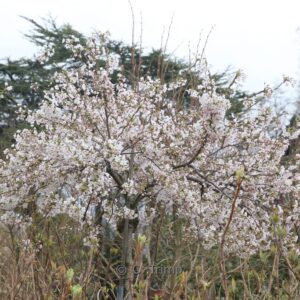 Very rich flowering small tree; flowers with light almond. This plant grows to about 4 meter. The flower colour is first light pink; than white. The flowering period is March – April. This plant is completely hardy. Recommended quantity per square meter : 1. Common name : Yoshino cherry scent . This plant has received the following award: AGM, Award of Garden Merit, 1993. . Only available when ordered in advance.