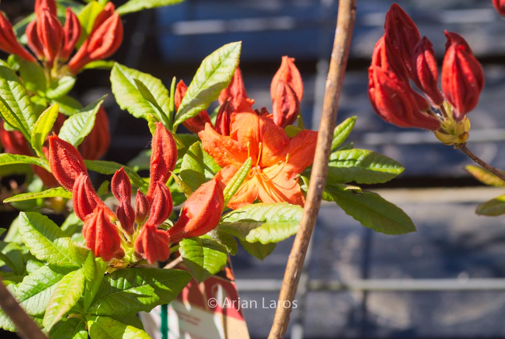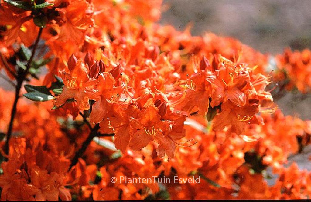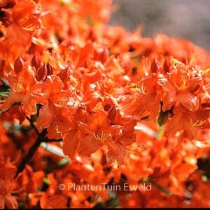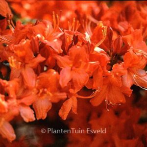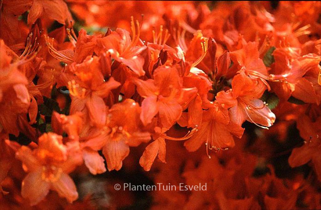 Knap Hill-exbury Azalea. The size after 10 years is 200 cm. The flower colour is reddish orange. The flowering period is May. This plant is completely hardy. . This plant has received the following award: AGM, Award of Garden Merit, 1993. . Only available when ordered in advance.