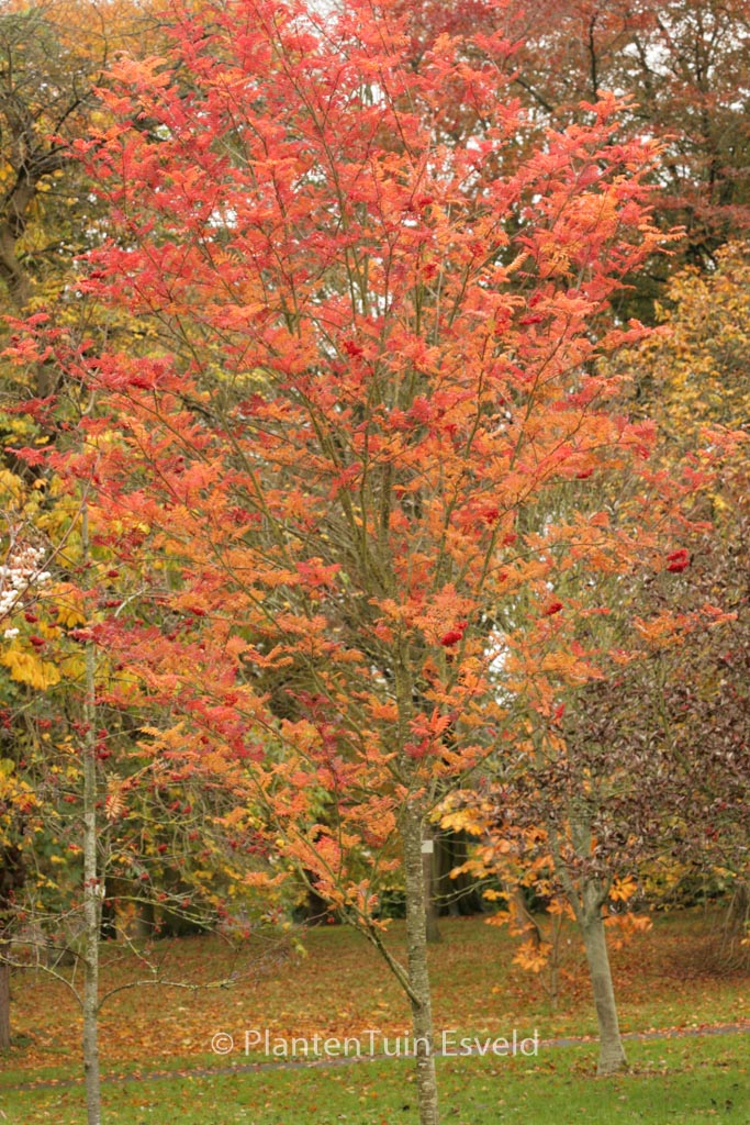Tree with very good autumn colours and fruit. This plant grows to about 6 m. The berry colour is bright orange. The flowering period is September. This plant is hardy. Recommended quantity per square meter : 1. Common name : Japanese rowan . . Is present in the plant shop. Please check actual availability in the current stocklist.