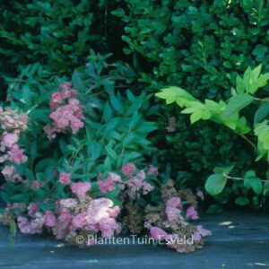 summer flowering shrub also well growing on poor soils. The size after 10 years is 100 cm. The flower colour is rose red. The flowering period is June – August. This plant is completely hardy. Recommended quantity per square meter : 3. Common name : Spirea . This plant has received the following award: Award of Merit First Class by the Royal Society for Boskoop Cultures 1895. . Only available when ordered in advance.