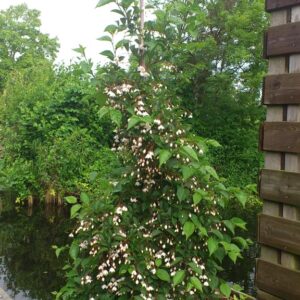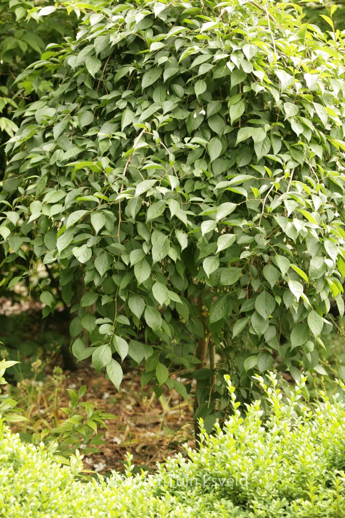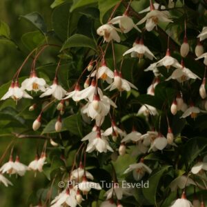 pendulous Styrax tree with mushroom shaped habit. The size after 10 years is 100 cm. The flower colour is white. The flowering period is April – May. This plant is completely hardy. Recommended quantity per square meter : 1. Common name : Snowbell tree . . Only available when ordered in advance.
