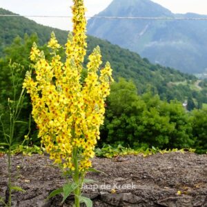 Black torchs with a felty-grey leaf underside. This plant grows to about 1 meter. The flower colour is yellow with lilac red antlers. The flowering period is June – August. This plant is hardy. Recommended quantity per square meter : 5. . . Only available when ordered in advance.