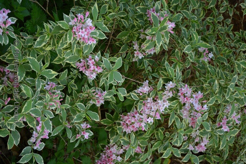 variegated shrub rich flowering shrub. The size after 10 years is 150 cm. The flower colour is pink. The flowering period is May. This plant is completely hardy. Recommended quantity per square meter : 2. Common name : Weigela . This plant has received the following award: AGM, Award of Garden Merit, 1993. . Only available when ordered in advance.